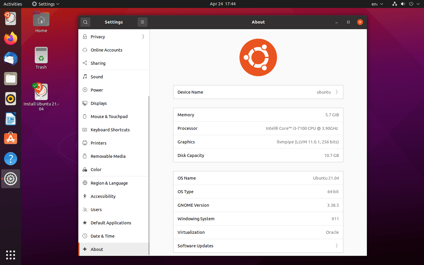 Ubuntu 21.04 (Hirsute Hippo) was released on April 22, 2021, it was preceded by version 20.10 and available for desktop / laptop computers and servers. Ubuntu 21.04 desktop didn't support 32-bit CPU architecture, and is only available to install 64-bit (x86-64) versions. Compared to previous releases, this Ubuntu version includes some new features and updates, such as Linux Kernel 5.11, Firefox 87, LibreOffice 7.1.2-rc2, Thunderbird 78.8.1, PulseAudio 14, BlueZ 5.56, NetworkManager 1.30, Secureboot has been improved on amd64 and arm64 CPUs, added support for smartcard authentication, Wayland graphics by default, Flutter application development SDK, redesigned dark theme, desktop view now properly drag and drop interaction, native Microsoft Active Directory integration etc.